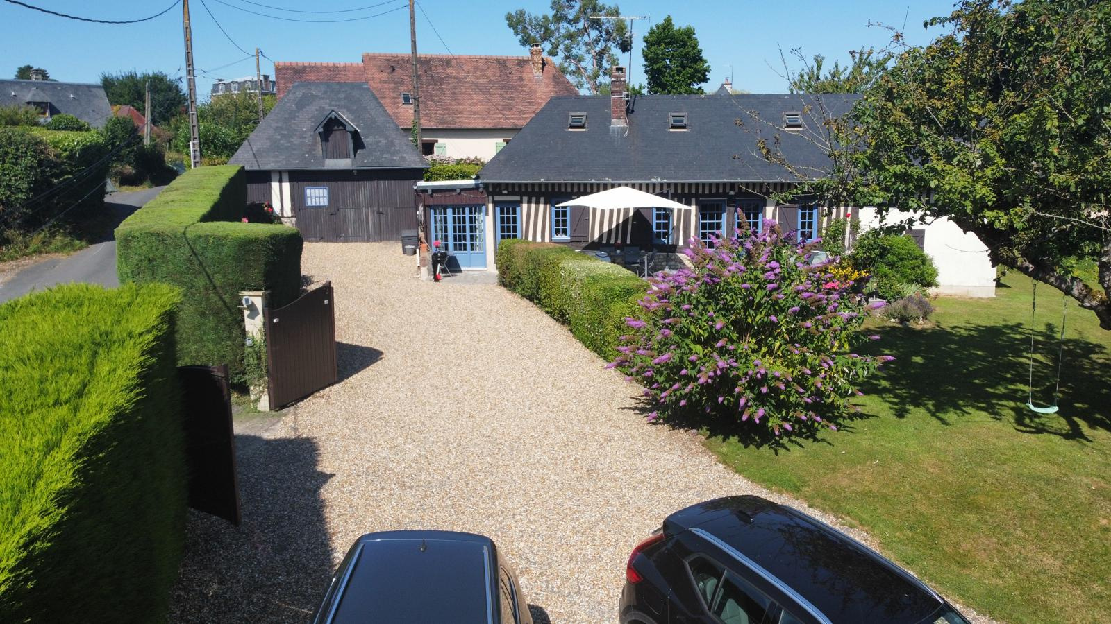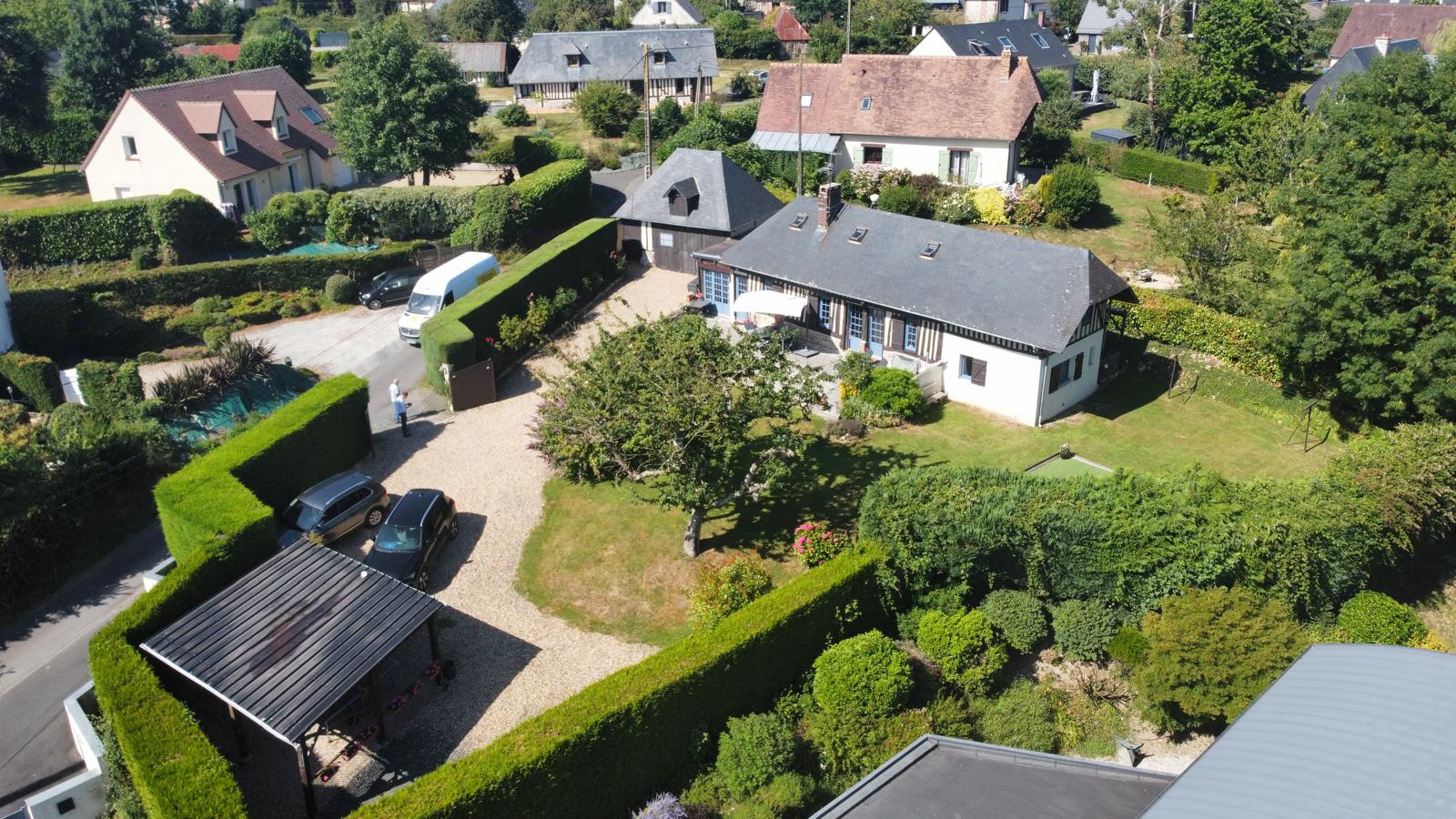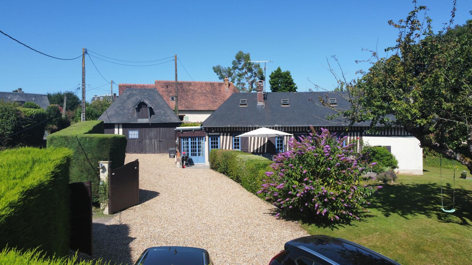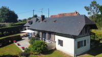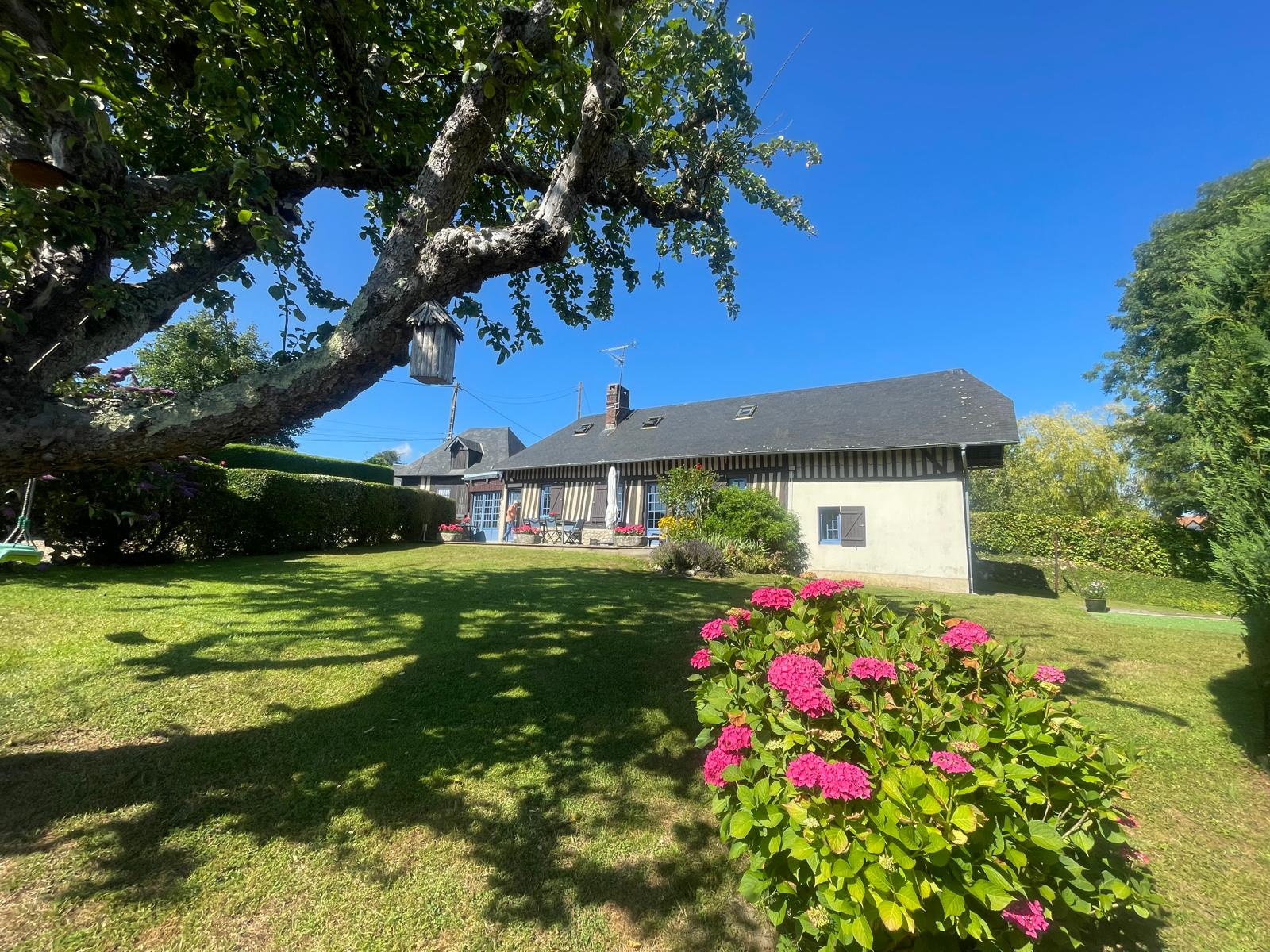 Jolie Maison Normande sur une parcelle de terrain de 1152 m² avec vue dégagée et comprenant rdc : cuisine aménagée et équipée , une salle de billard séjour, grand salon avec cheminée, buanderie, salle de bains avec W.C; une chambre avec W.C. à l'étage : couloir intégral équipé de placards intégrés desservant : trois chambres, salle de douche et W.C. Accolé : garage, atelier Le bien est vendu meublé